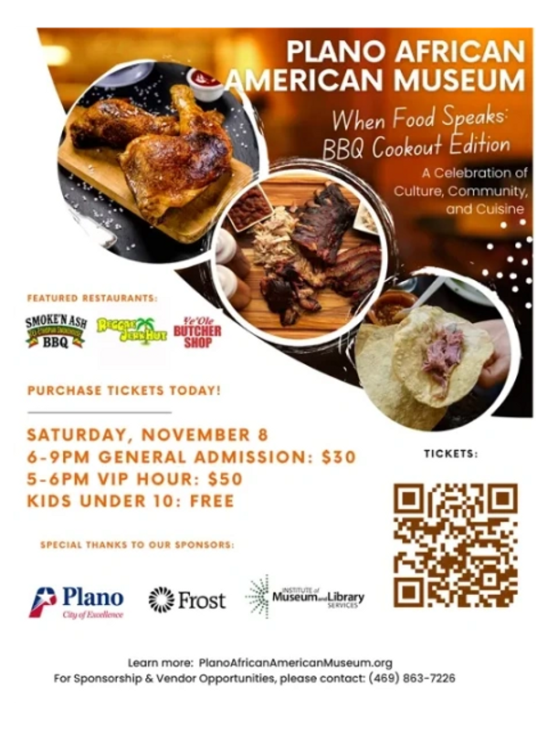 Begin your evening with exclusive early access to the event grounds, private seating, and curated BBQ tastings before general admission. Enjoy a Champagne Walk-Through Tour of the Plano African American Museum and current exhibits led by Executive Director, Dollie Thomas, and meet the featured artists.